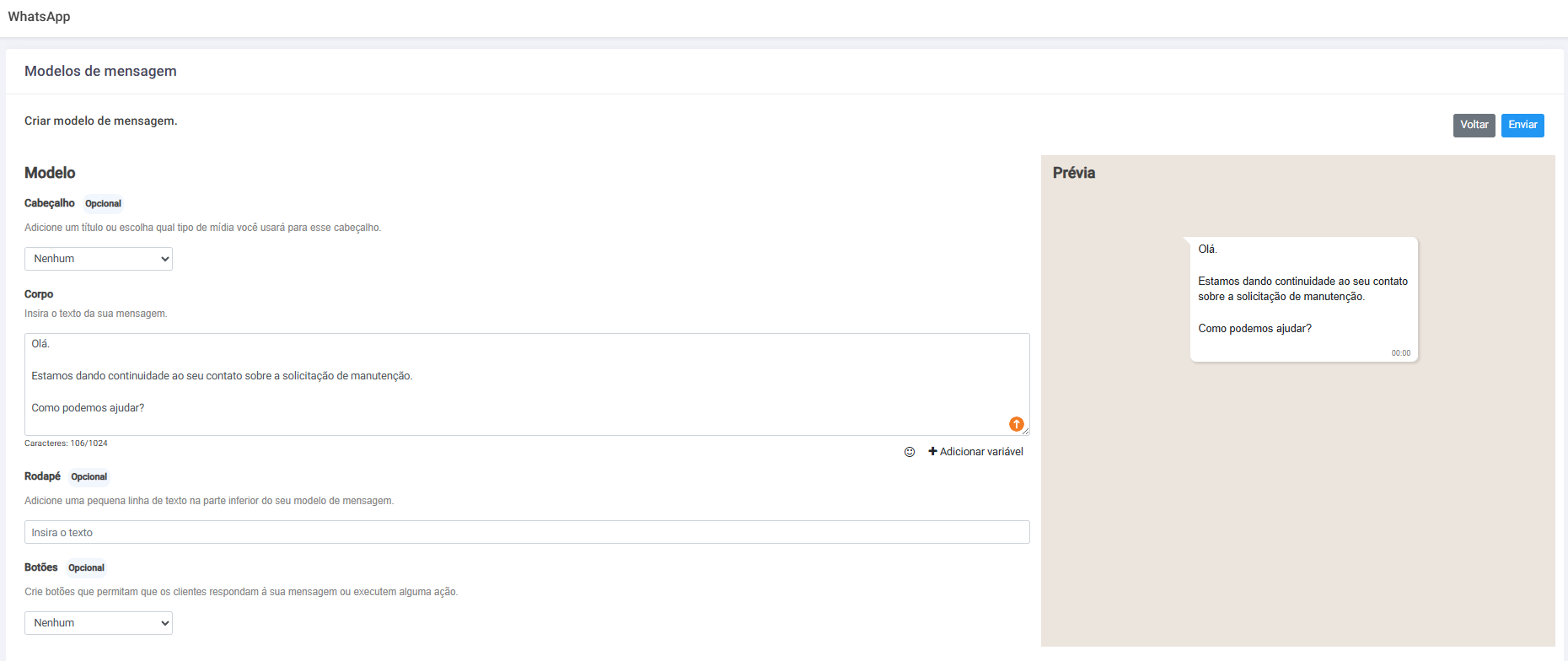 - Exemplo: "Olá, {{nome}}. Estamos dando continuidade ao seu contato sobre a consulta de imóveis. Como podemos ajudar?"